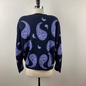 Vintage 80s Knit Cardigan Large Open Pappagallo Dark Blue Purple Beaded Paisley