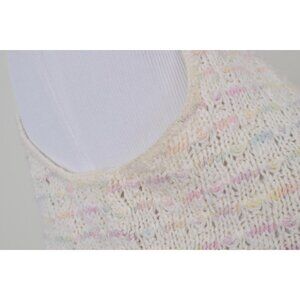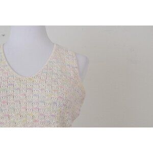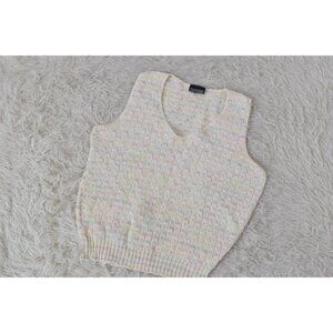 Vintage beige/pastels variegated yarn knit vest. There is some pilling on the knit and the pits look like they are stained a bit; it is hard to tell because of the yarn color besides that in good vintage condition.