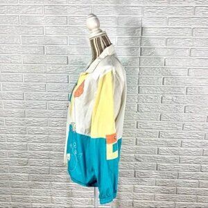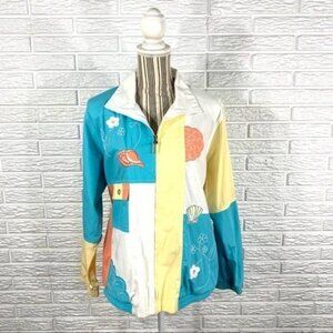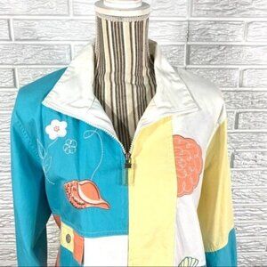 Vintage 80s lightweight ocean themed jacket featuring embroidered flowers and seashells by Koret. Size Medium. Shoulder pads. Blue, white, yellow and coral.
