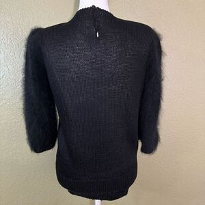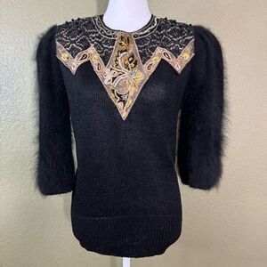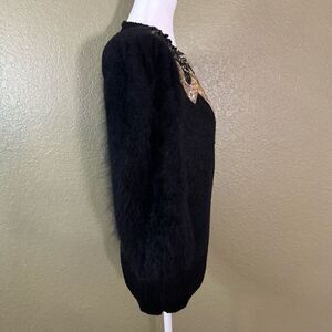 Vintage 80's L Bead Embroidered Pullover Sweater Black Angora Sleeve Maximalist