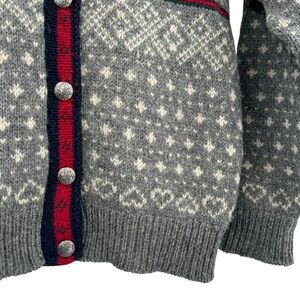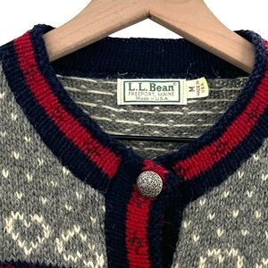 Women's vintage 80s L.L. Bean button front cardigan wool blend sweater in a gray and cream fair isle pattern with navy blue and red trim. Silver metal buttons.