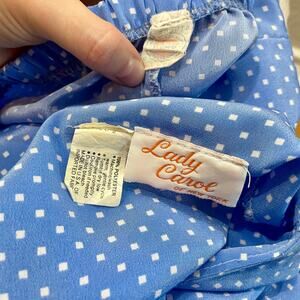Step back in time with this charming vintage 80s Lady Carol skirt set! Featuring a delightful blue and white polka dot pattern, this nautical-themed ensemble includes an oversized top and a matching skirt. Perfect for adding a touch of retro flair to your wardrobe.