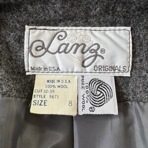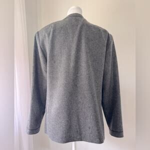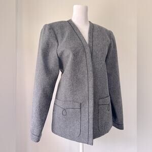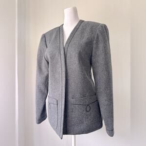 A lovely vintage ‘80s piece from historic Austrian fashion label Lanz, this 100% wool dark gray jacket features an open front style, full lining, and front pockets.