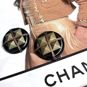 Vintage 80s Large Round Post Black Copper Art Deco Earrings