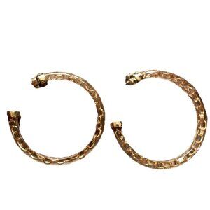 These vintage 80's Largo gold tone hoop dangle earrings are a statement piece featuring round-shaped lucite material in a striking gold color. The earrings are approximately 3 inches in length and secured with a hook closure. Made by Estate, they embody a retro fashion style that is perfect for women looking to add a touch of nostalgia to their jewelry collection. These earrings are a unique and eye-catching accessory that will elevate any outfit with their bold design.