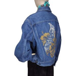 Vintage 80s Lee Artsy Denim Hand Painted Cockatoo Flowers Trucker Jean Jacket