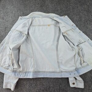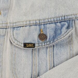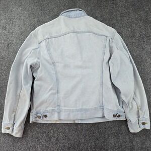 Vintage 1980s Lee denim trucker jacket in light wash, made in the USA. Men's Large based on 25" pit to pit and 24" length. Features button-front closure, chest flap pockets, vertical hand pockets, and Lee M.R. yellow tab branding. Tag is missing. Distressed with collar fraying, staining throughout, and a tear inside the collar.