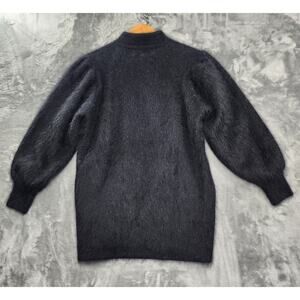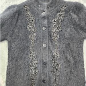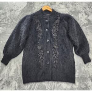 Vintage 80s Lee Sands Sweater Womens OS Black Rabbit Angora Hair Cardigan Beaded