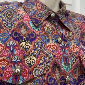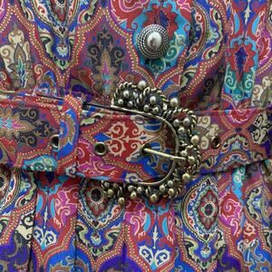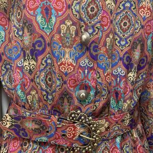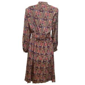 This vintage 80s Leslie Fay belted pleated midi secretary dress in size 12 petite is a classic piece with a geometric multi colored pattern. The dress features long sleeves, a collared neckline, and a pullover closure, making it suitable for various occasions like weddings, parties, casual outings, and business events. Made of polyester, this fit & flare style dress also includes accents like pleats, buttons, and is machine washable for easy care. This dress is a timeless piece with a touch of 80s and 90s style.