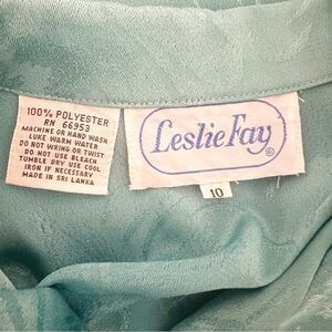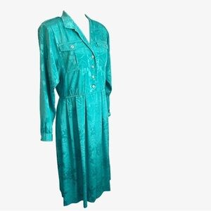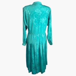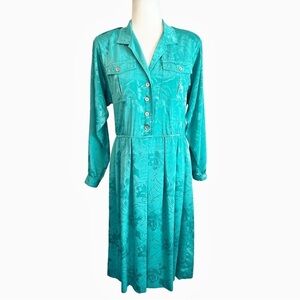 Vintage 80s Leslie Fay Teal Floral Embossed Jacquard Satin Pleated Shirt Dress
