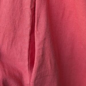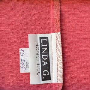 Vintage 1980s color block linen blend Hawaiian Maxi Dress from Linda G. Honolulu Hawaii. Round neckline. Slightly padded shoulders. One on seam hip pocket. Vibrant coral pink with tan leaves appliqué and tan collar / hem. 55% linen 45% rayon. Lightweight and breathable. Made in Hawaii USA. Excellent preowned condition. No flaws.
