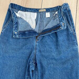 Ulta high waist and three pockets medium-dark wash made from 100% cotton classic denim. Pleated at the waist and a relaxed, slightly tapered leg and zipper fly. Not sure why this is marked “short” my flat measurements show an average inseam. Note; there are some small speckled black and white marks behind the knee of the left pant leg (shown in pictures). No other major marks or flaws.