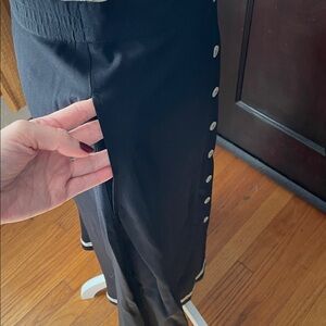 Vintage 1980s Liz Sport skirt with a chic nautical sailor vibe. Black midi length style with crisp white stripe accents at the hem and classic white buttons down the front. Designed with functional pockets and made from soft rayon, this skirt balances comfort and timeless style. A versatile vintage women’s size 8 piece that pairs perfectly with a tucked-l in blouse or simple tee for that effortless retro look.
