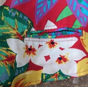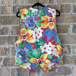 Vintage 1980s stunning floral allover print vest from LizWear by Liz Claiborne. Red, blue, white, yellow, orange, purple. Fully lined. Missing one button on back tab (pictured). 4 front slip pockets. 3rd picture shows a light discoloration near bottom hem. True vintage. 100% rayon.