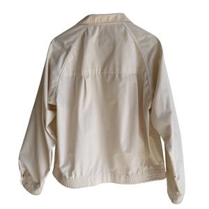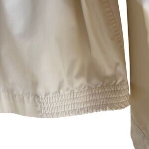 Classic vintage London Fog lightweight jacket in a neutral cream tone. Features a zip front, point collar, reglan sleeves, side pockets, and elasticized back hem.