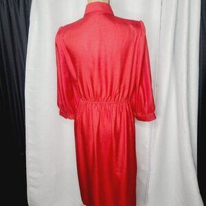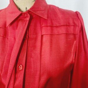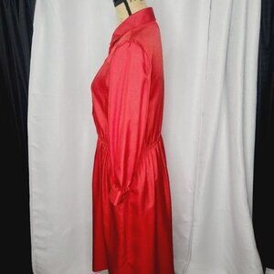 DETAILS: classic solid red Elastic waist shirt style dress with hidden front buttons, long button sleeves, and a Collared neck. hand wash. made in Taiwan. unlined.