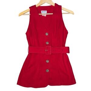 VTG California Cover longline 80s vest in tag size 5. Bright cherry siren red color. Original gold buttons. Comes with original belt. Made in the USA. As with all vintage, please review measurements. PLEASE READ - does have some very faint discolorations, see pics, and wear on belt. Professional, highly rated seller, quick shipper, open to offers!
