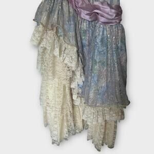 Fabulous women's vintage 1980s Loralie Original prom dress. Made in the USA. This dress has all the 1980s poof and lace your heart could possibly desire. Floral fabric with shimmer lace overlay, asymmetrical hem, drop waist, satin sash, and so many ruffles. Women's size 10. Please see the measurements below. This dress is in excellent preowned condition. It does have some yellowing of the inner lining due to age and one spot on the under layer of the skirt where there is a small mud splatter.