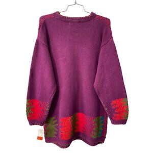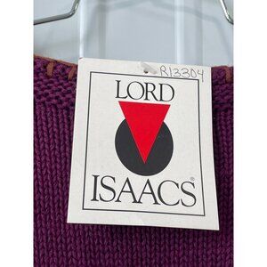 This Lord Isaacs medium sweater features a bold geometric multicolor design in purple, red, green, and blue. Crafted from a 55% ramie and 45% cotton blend for durability and comfort.