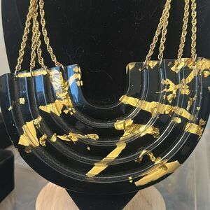This stunning necklace features a bold black design with elegant gold accents, perfect for adding a touch of sophistication to any outfit.