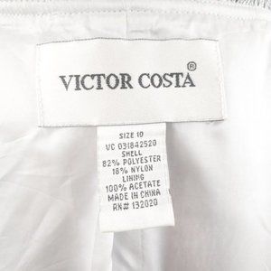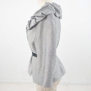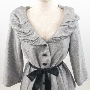 Vintage 1980s Victor Costa crinkle silver blazer. Stunning textured metallic shirt jacket w wide v-neck & statement ruffle collar. Button front w removable adjustable ribbon sash tie belt. No pockets. Hip length, 3/4 sleeves, jewel buttons. Fab for holidays new year's parties! EUC.