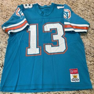 Vintage 1980s 80s MacGregor Sand-Knit NFL Miami Dolphins # 13 Dan Marino collectible football jersey, 13 on front, 3 stripes on sleeve with dolphin on sleeves, 13 on back, logo tag at front hemline. 100% nylon