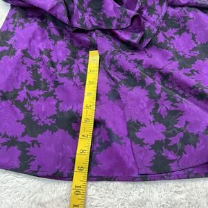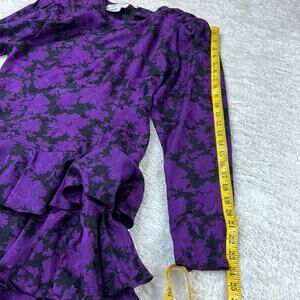 100% silk long sleeved party dress in black and purple pattern. Drop waist, with tiered ruffles and back zip closure. Sleeve cuffs are button and loop closure, and there are shoulder pads. No stretch and no pockets.