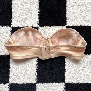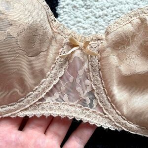 The perfect vintage bra, Union Made in USA from the 80s. Brand is Maidenform. Strapless and has gel along the edges to help hold it up. Subtle floral print on the cups, the strap is plain. In pristine condition, the tag is super crispy and I don’t think this was ever worn!