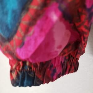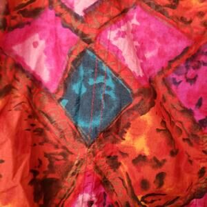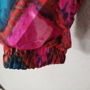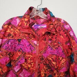 The real deal. Made by Mariah, full zip windbreaker with pockets in reds, pinks and some teal/blue. Elastic waist and wrists. Great condition.