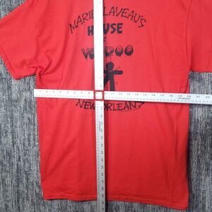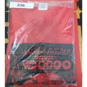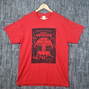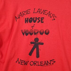The product is a vintage 80s Marie Laveau's House of Voodoo New Orleans T-shirt in size large. Made by the brand Delta, this red shirt features the iconic character Marie and is themed around the 80s. This regular fit T-shirt is perfect for men who appreciate retro fashion and unique styles.