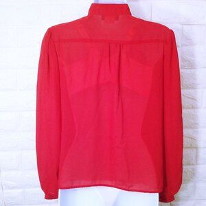 -- Mariel made in USA, women - S(6), high band 2-button neck with scarf cravat collar, covered Buttons front, long gathered cuffed sleeves, easy care featherweight semi-sheer polyester crepe fabric in bold bright solid red colorway.
