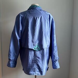 Oversized style 1980s windbreaker, jacket or coat, constructed from iridescent, shiny, pearl, shimmery, opalesque periwinkle-lavender textured fabric with turquoise-teal accents. Drawstring for adjustable gathered waist, deep front pockets. Non removable shoulder pads. Label states medium but please see measurements.