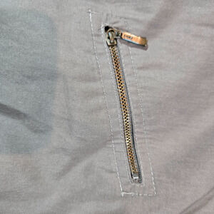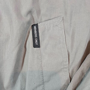 Vintage 1980s Members Only jacket in gray with the rare Europe Craft rainbow tag — iconic lightweight style from the era. Features the signature epaulets, front chest pocket, and zip closure that made Members Only a cultural staple.