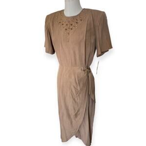 NWT vintage 80's metal stud embellished Tan Brown Dress with short sleeves, a faux wrap style skirt, shoulder pads, and a classic tulip style hemline. Brand is Scarlett, never worn, and it still has tags in tact.