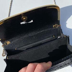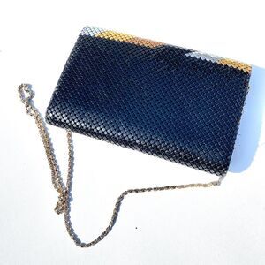 Step into statement style with this vintage 1980s metal mesh evening bag, a shimmering mix of black, gold, and silver diagonal stripes that catches light beautifully from every angle. Its sleek envelope design and versatile chain strap make it equally perfect for cocktail parties, weddings, or holiday celebrations.