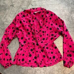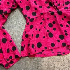 Vintage 80s Michelle Stuart Silk Pink Black Polka Dot Peplum Blouse Shirt 6