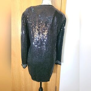 Elegant black jacket adorned with shimmering sequins. Features intricate silver embroidery. Perfect for special occasions. great condition. 24" armpit to armpit