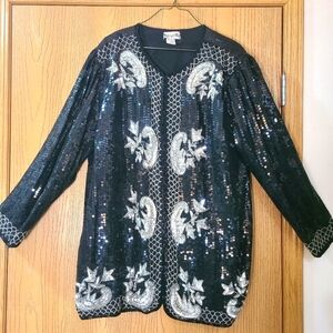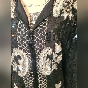 Elegant black jacket adorned with shimmering sequins. Features intricate silver embroidery. Perfect for special occasions. great condition. 24" armpit to armpit