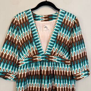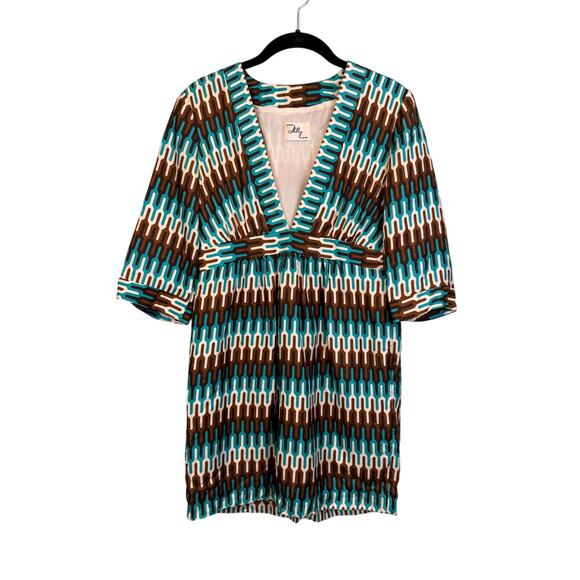Vintage 80s Milly NY Mini Kimono Dress XS/S Blue Geometric Silk Pullover V-Neck
