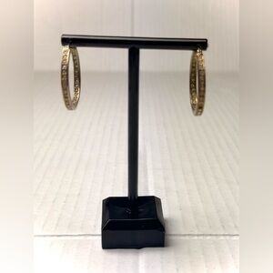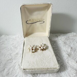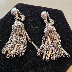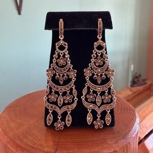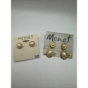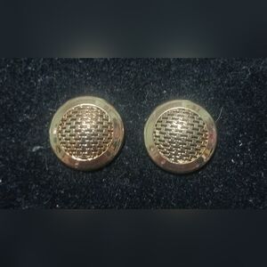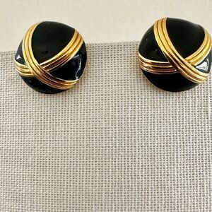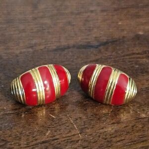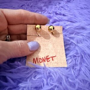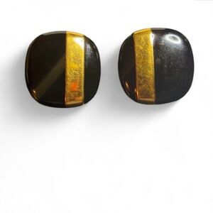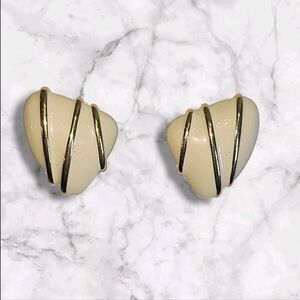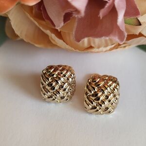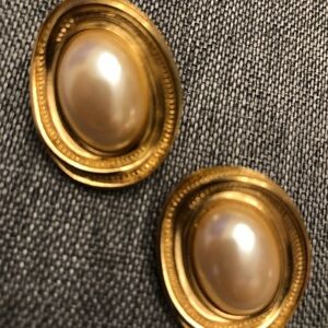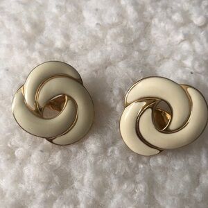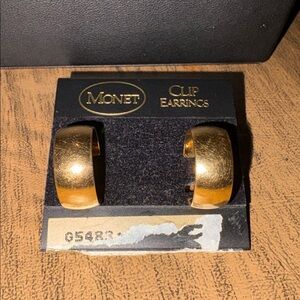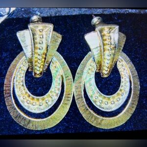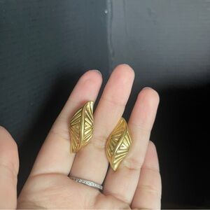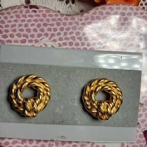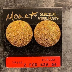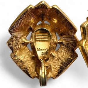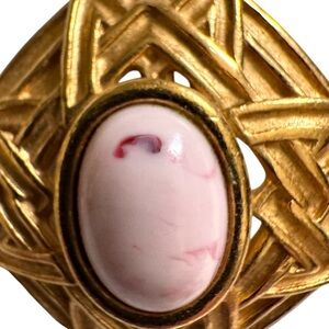 Bold and elegant vintage clip-on earrings by Monet featuring a layered gold-tone geometric design with a marbled pink cabochon center. These statement earrings add a touch of retro glam and are perfect for collectors or vintage lovers. Secure clip backs. Signed Monet.