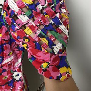 Insane statement sleeves + bold floral print 🌸 This new old stock beauty from the 80s has puff shoulders with woven lattice cutouts, bright colors, and white button front. 100% cotton, made in USA.