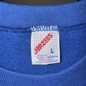 This item is a vintage 80s JERZEES blue crewneck sweatshirt in size large for men. It features a pullover style, making it easy and comfortable to wear. The retro 80s theme adds a nostalgic touch to the design, making it a stylish choice for those who appreciate vintage fashion. Perfect for casual wear, this sweatshirt is a classic piece that can be paired with various outfits for a laid-back and cool look.