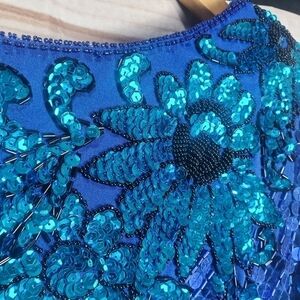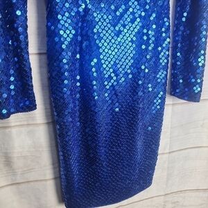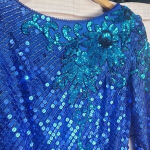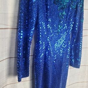 Vintage 80s Nadine Vibrant Blue Floral Sequins Long Sleeve Dress Size Medium