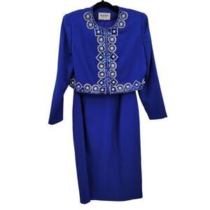 80's Nah Nah Petites Dress Set Royal Blue Pearl Sequin Jacket Midi