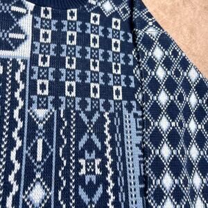 Long sleeve, pullover, tight knit, all over geometric, diamond, tribal & square prints in blue, navy and white. Patchwork / color block layout. Vintage 1980s, made in USA.