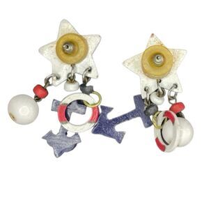 Vintage 80s Nautical Earrings Red White Blue Wood Dangle Pierced Anchor Sailor
