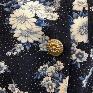 Very good condition! Dress has a navy blue base color with an all over floral print of blue and White. Dress features in elastic waist and pleated skirt. Puff shoulders with shoulder pads. Silver decorative and functioning button up the front from the waist to the end of the collared neckline. The dress does come with it’s original matching belt. The belt does show some wear on the faux leather interior but it is fabric on the front looks great