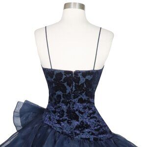 Vintage 80s Navy Blue Velvet Burnout Full Skirt Bow Dance Prom Party Dress XS S