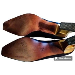 These pumps are crafted from a cotton blend upper material and have a leather insole for added comfort. The outsole is also made of leather, and the shoe is accented with a solid blue pattern and fabric lining. These shoes are a great addition to any wardrobe, whether you're a collector of vintage pieces or just looking for a stylish and comfortable shoe.