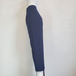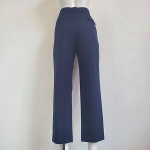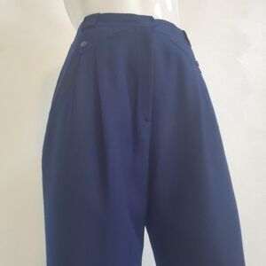 Vintage 80's navy blue wool trousers. High-waisted with partially elastic waistband, hook/zipper closure, front-pleating, 2 side pockets, fake back pocket, loose thigh, and cropped tapered leg.